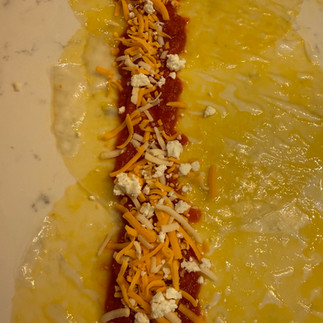 Spoon a small amount of marinara sauce into the center, then add shredded cheese, a few crumbles of goat cheese, and a sprinkle of oregano. Be careful not to overfill.