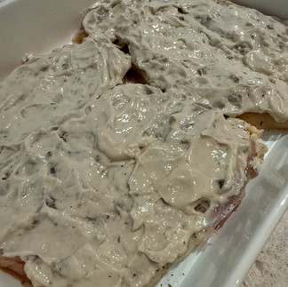 Spread the cream of mushroom soup over top of the seasoned chicken, making sure that each piece is coated.