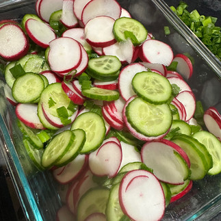 In a medium bowl, combine sliced cucumbers, sliced radishes and chopped green onion.