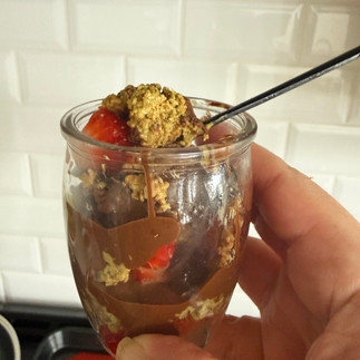 To assemble, spoon a layer of chopped strawberries into the bottom of a cup. Add a layer of the pistachio shredded wheat mixture, then drizzle or spoon over melted chocolate. Repeat the layers until the cup is full, finishing with chocolate on top.